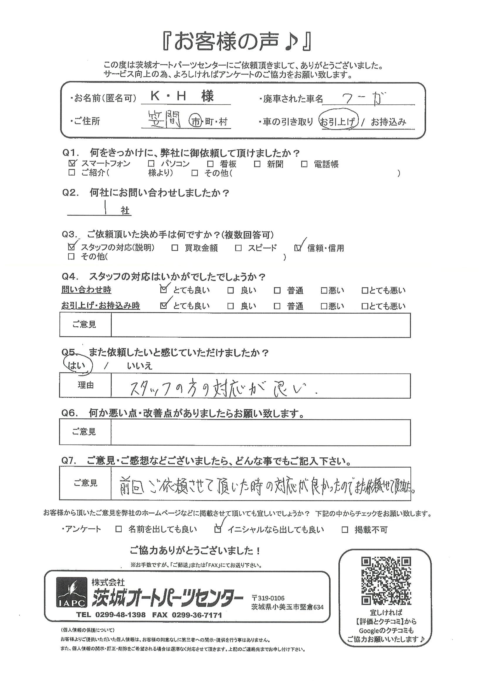 お礼:K・H様 この度は茨城オートパーツセンターに廃車のご依頼頂き、ありがとうございます!