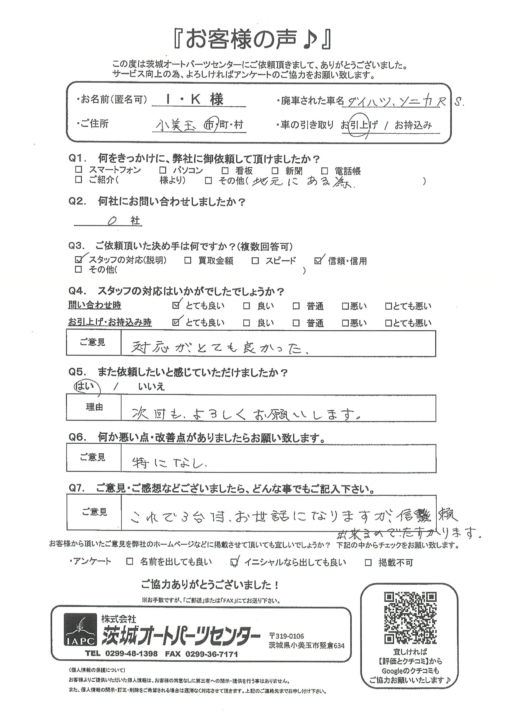 お礼:I・K様 この度は数社の中から茨城オートパーツセンターをお選び頂き、ありがとうございます!