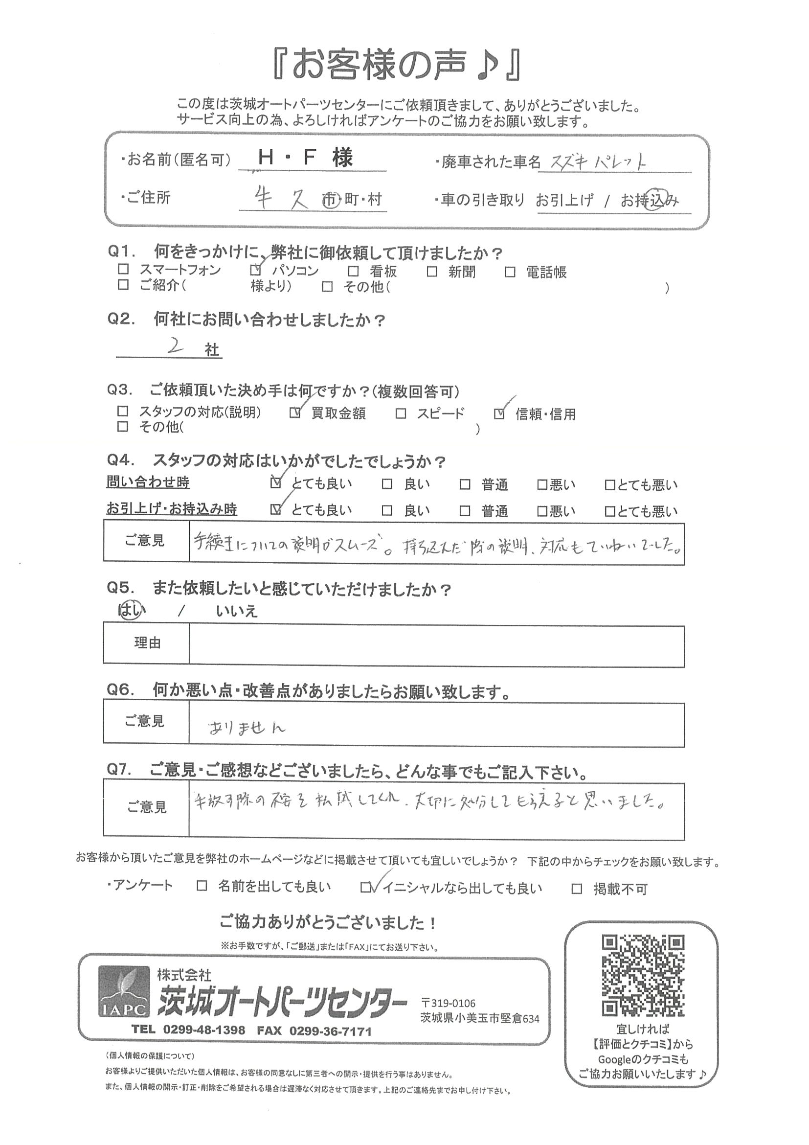 お礼:H・T様 この度は茨城オートパーツセンターに2度目の廃車のご依頼頂き、ありがとうございます!