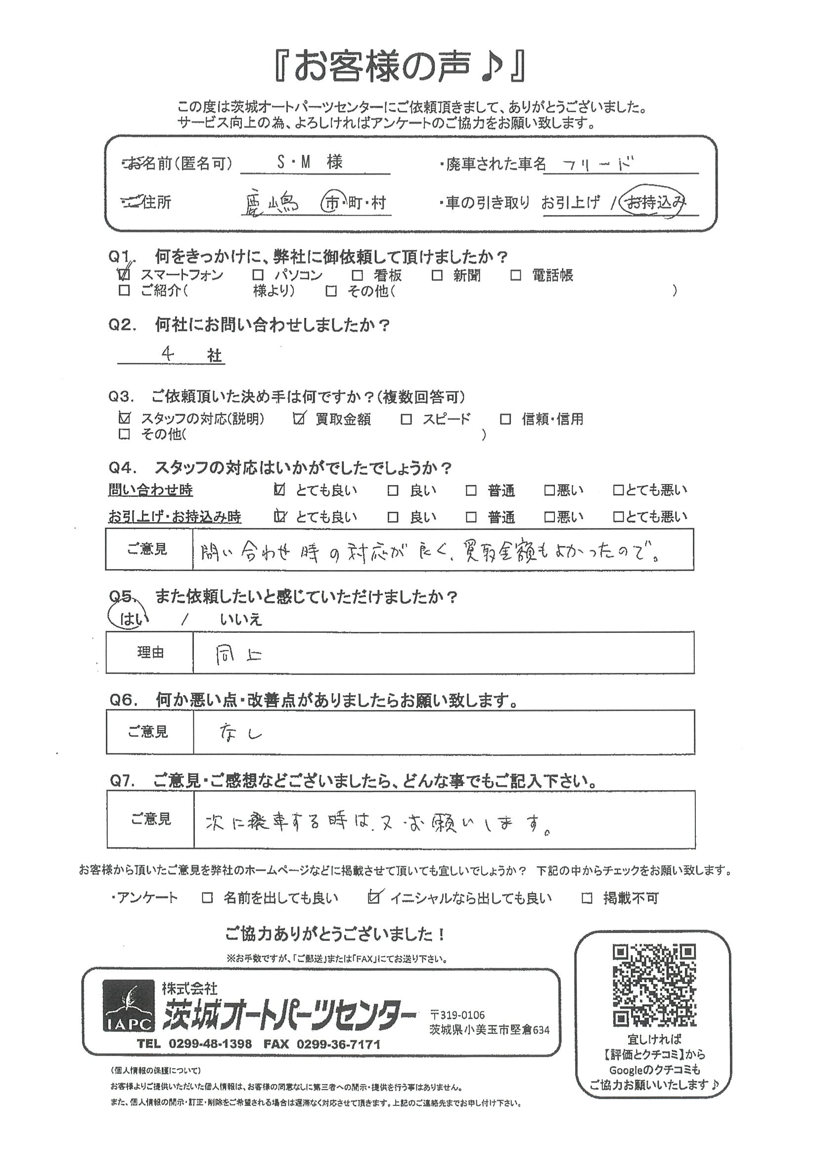 S・M 様 フリード 鹿嶋市からお持込み♪
