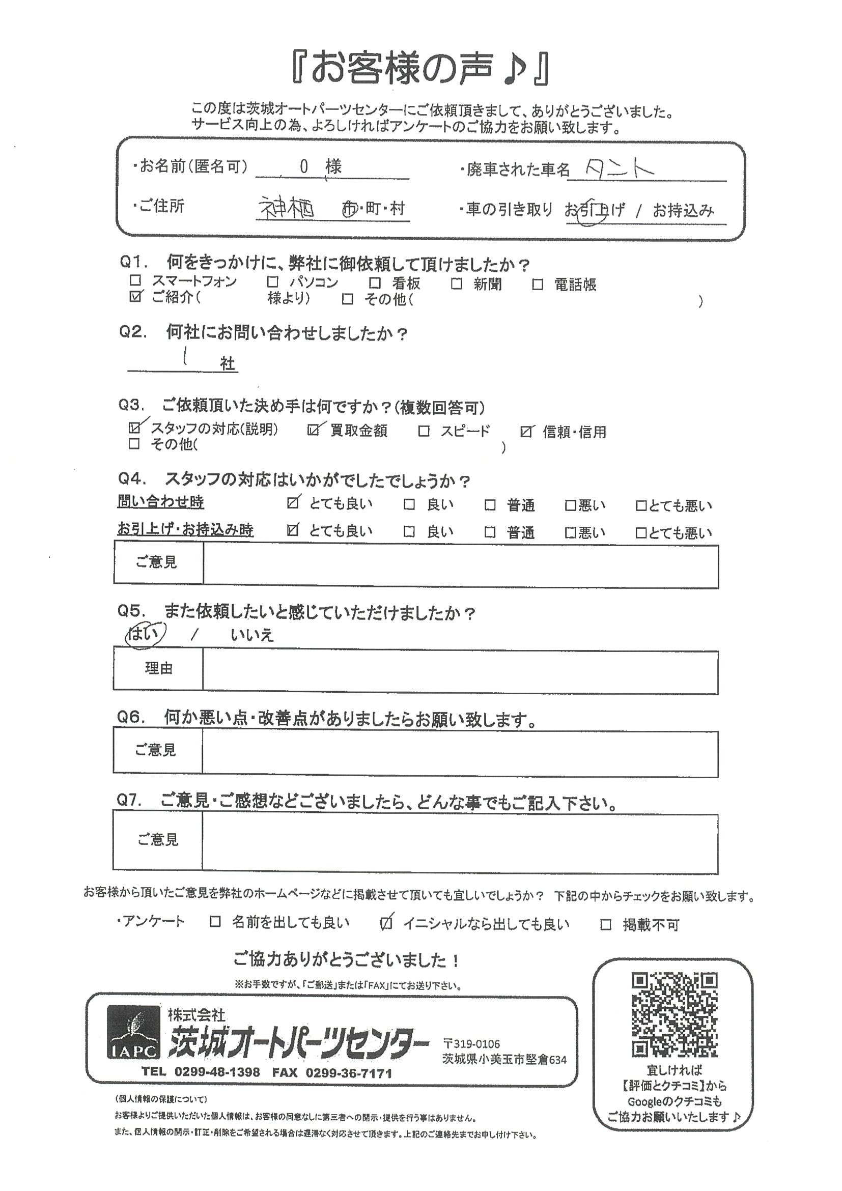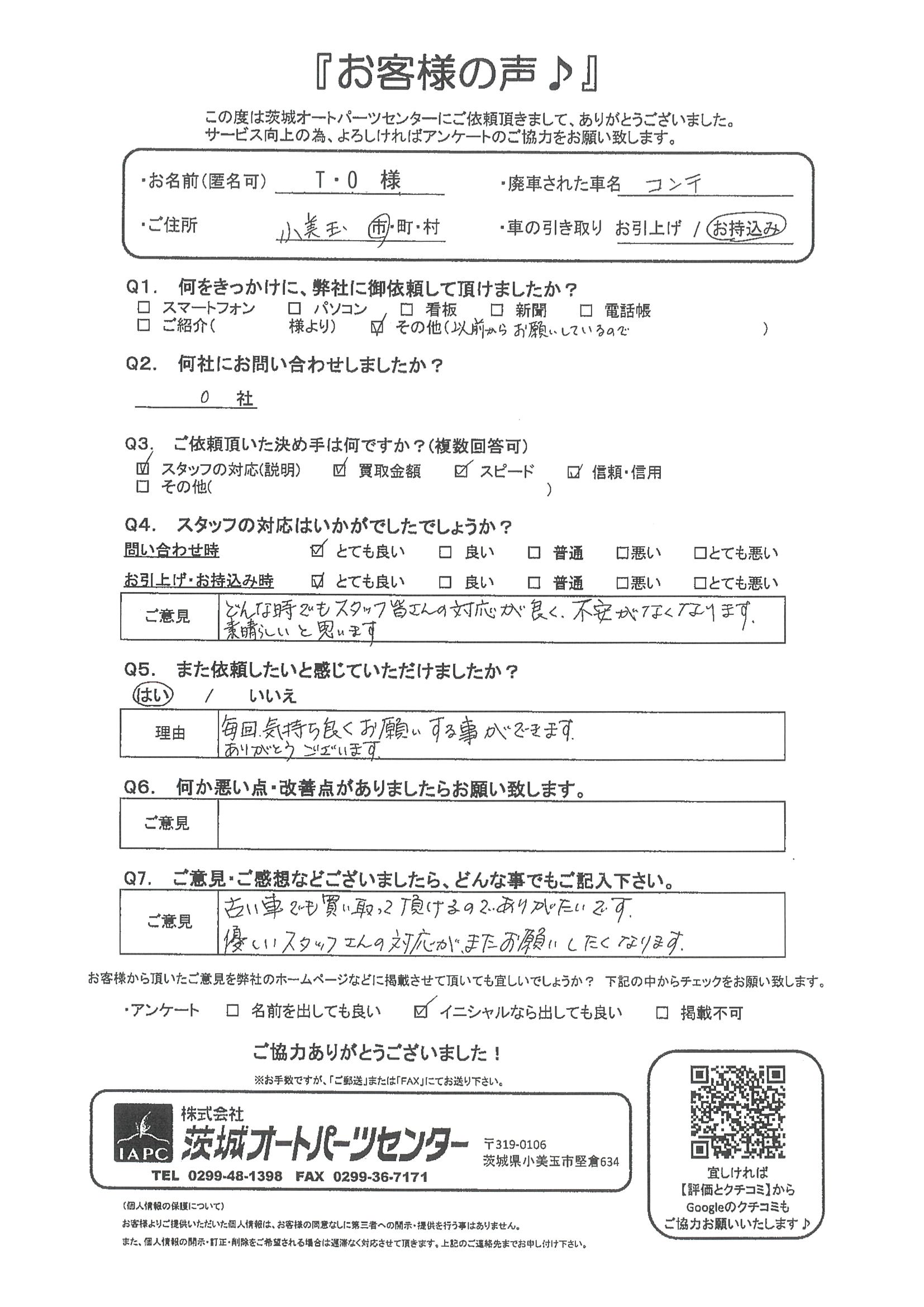 お礼:O 様 この度は数社のお問合せのなか、弊社に廃車のご依頼ありがとうございました。