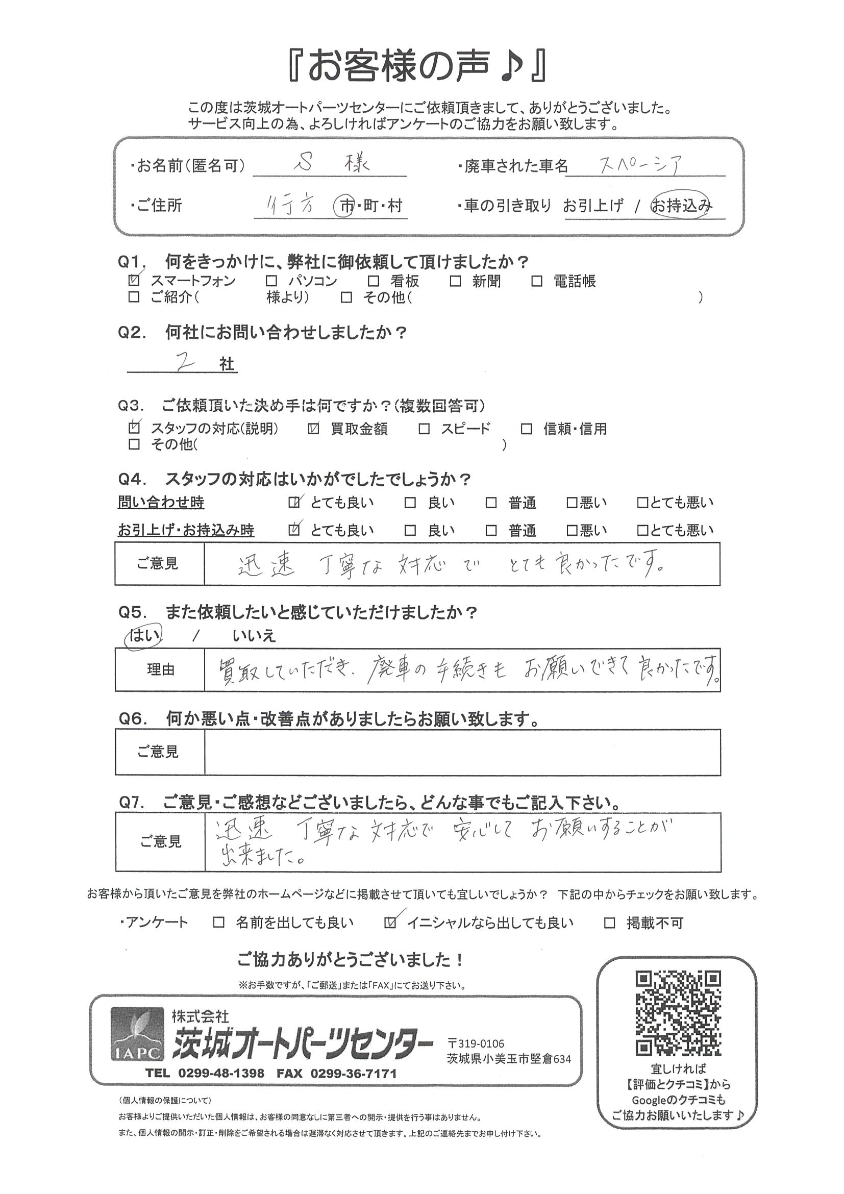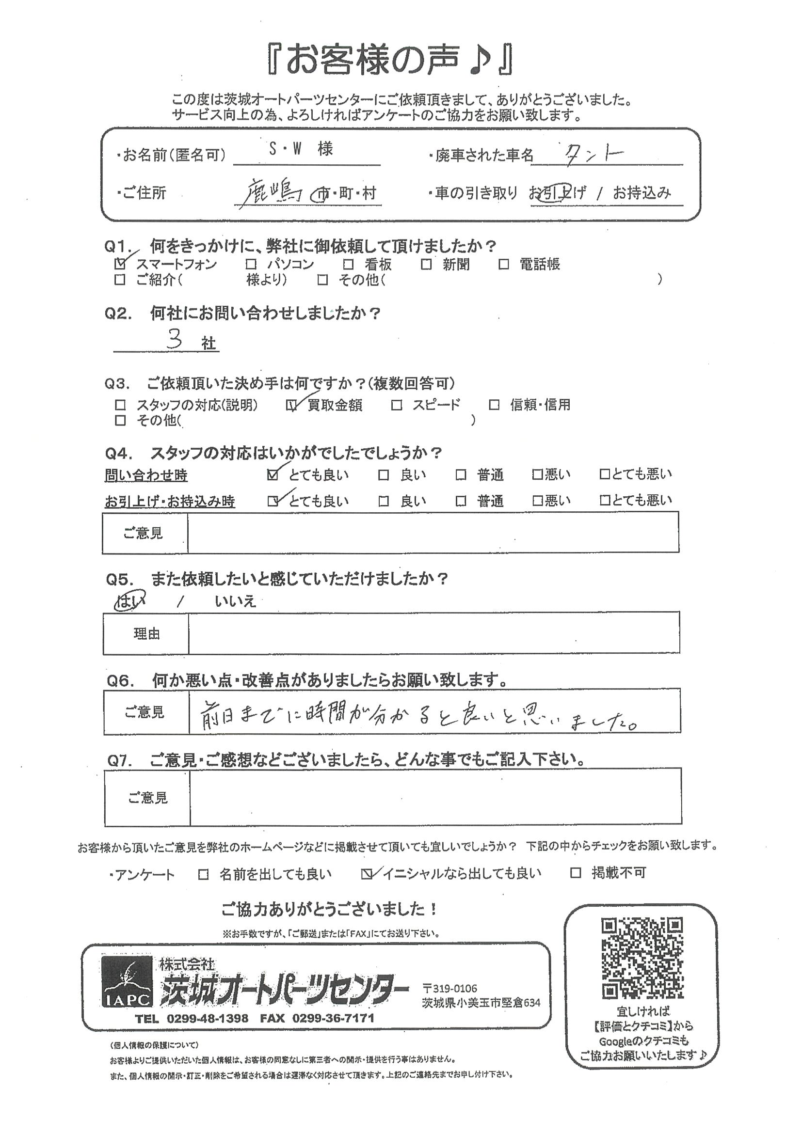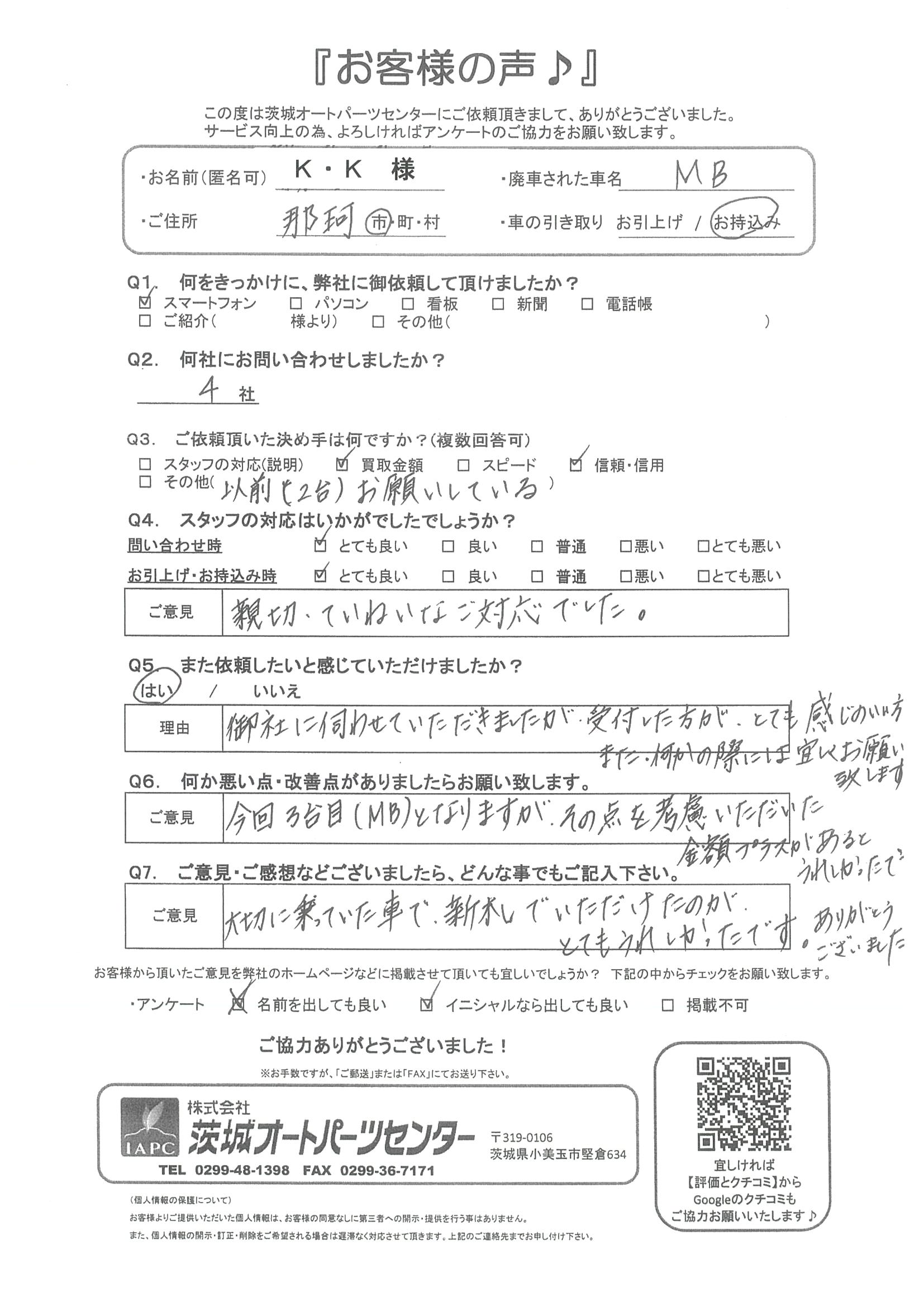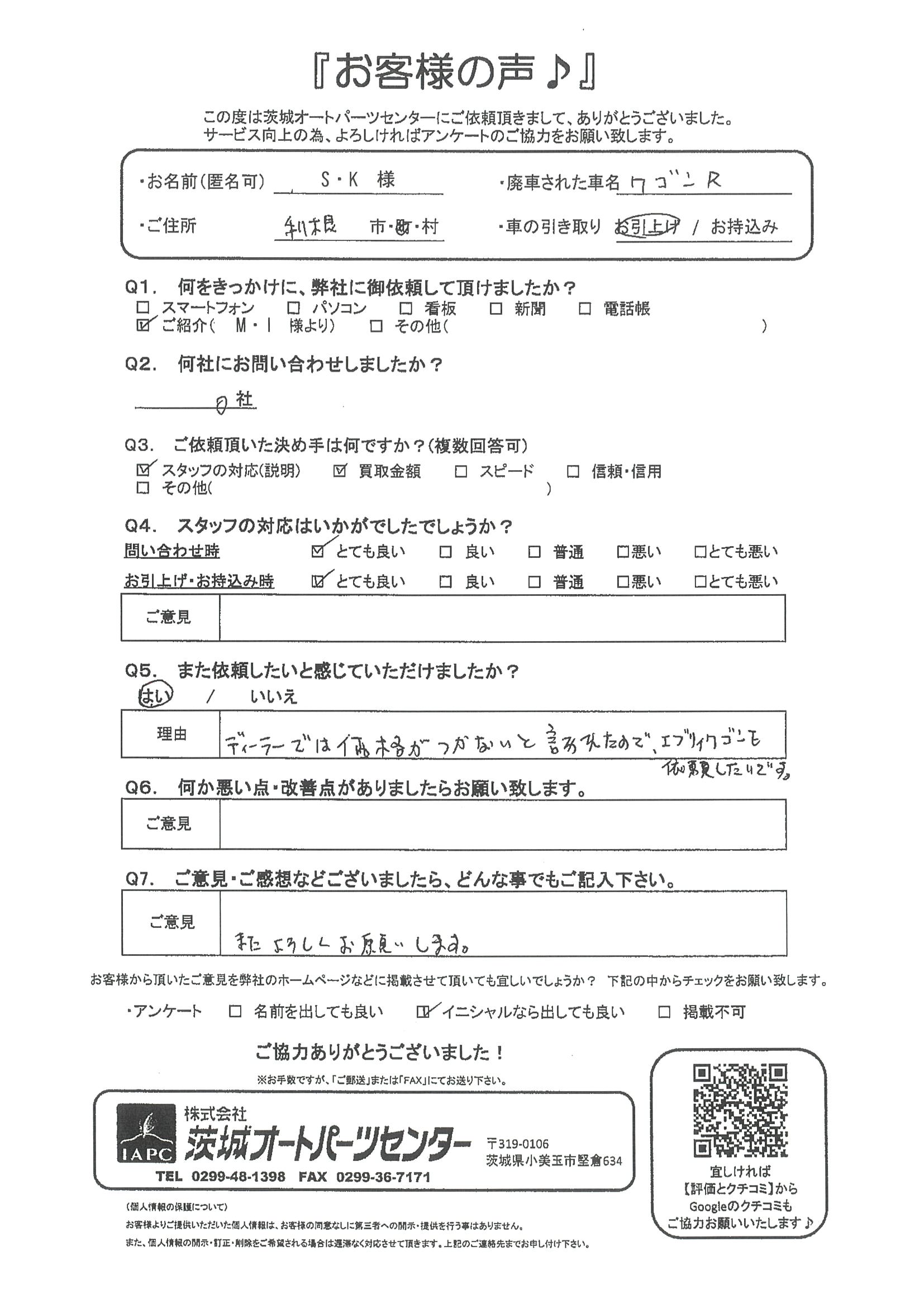 お礼:S・K様 この度は、廃車のご依頼いただき、ありがとうございます。