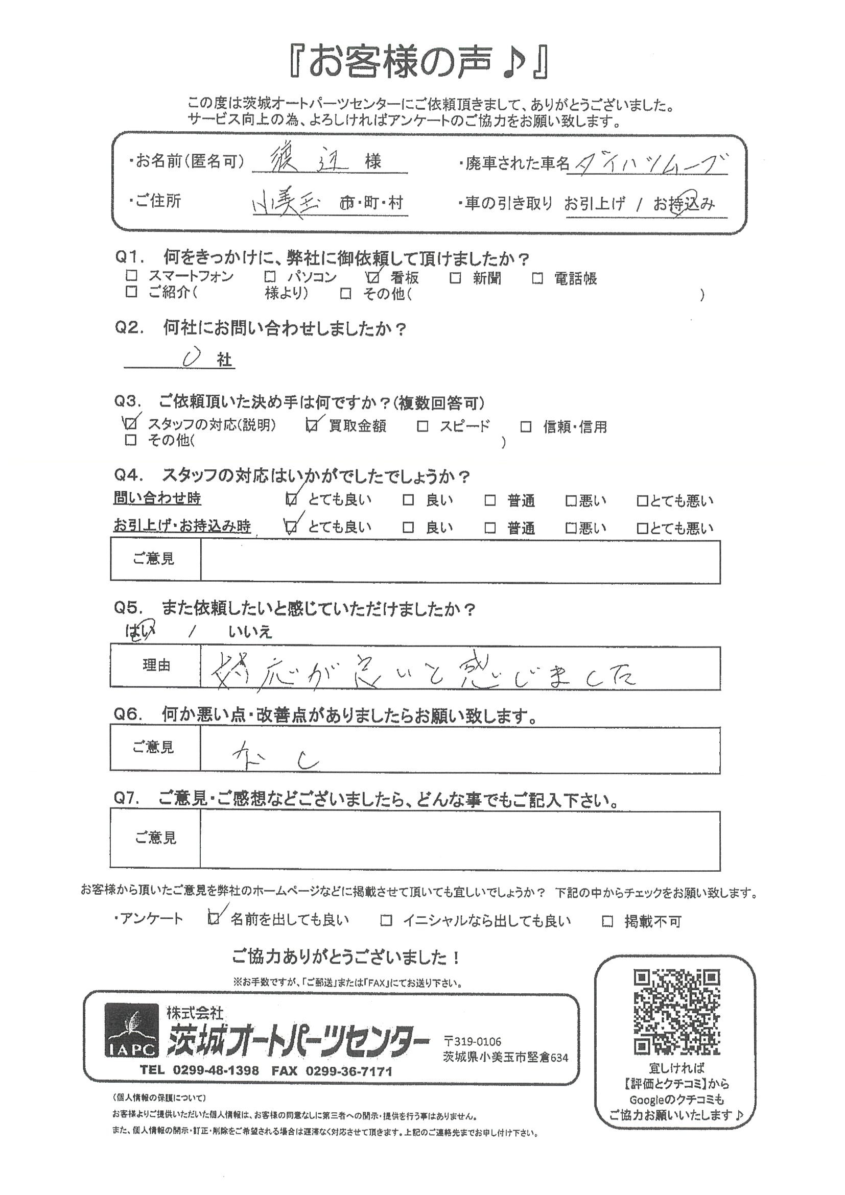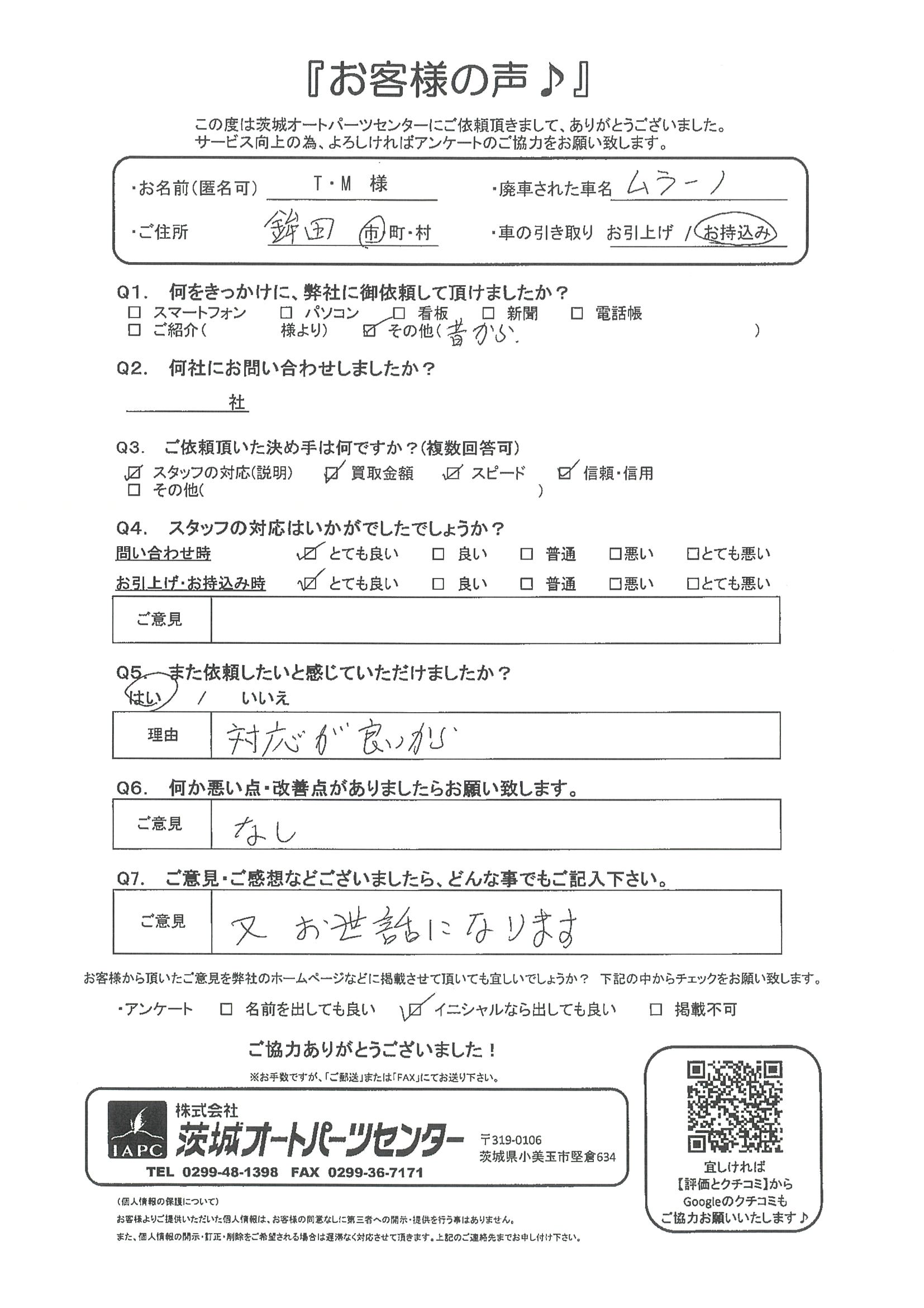 お礼:S・M様 この度は、娘様からのご紹介での廃車ご依頼ありがとうございます。