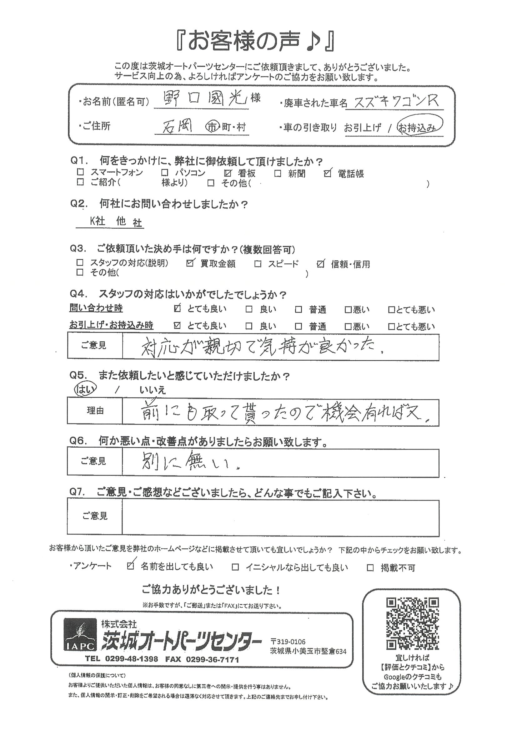 野口 様 ワゴンR 石岡市からお持込み🚙