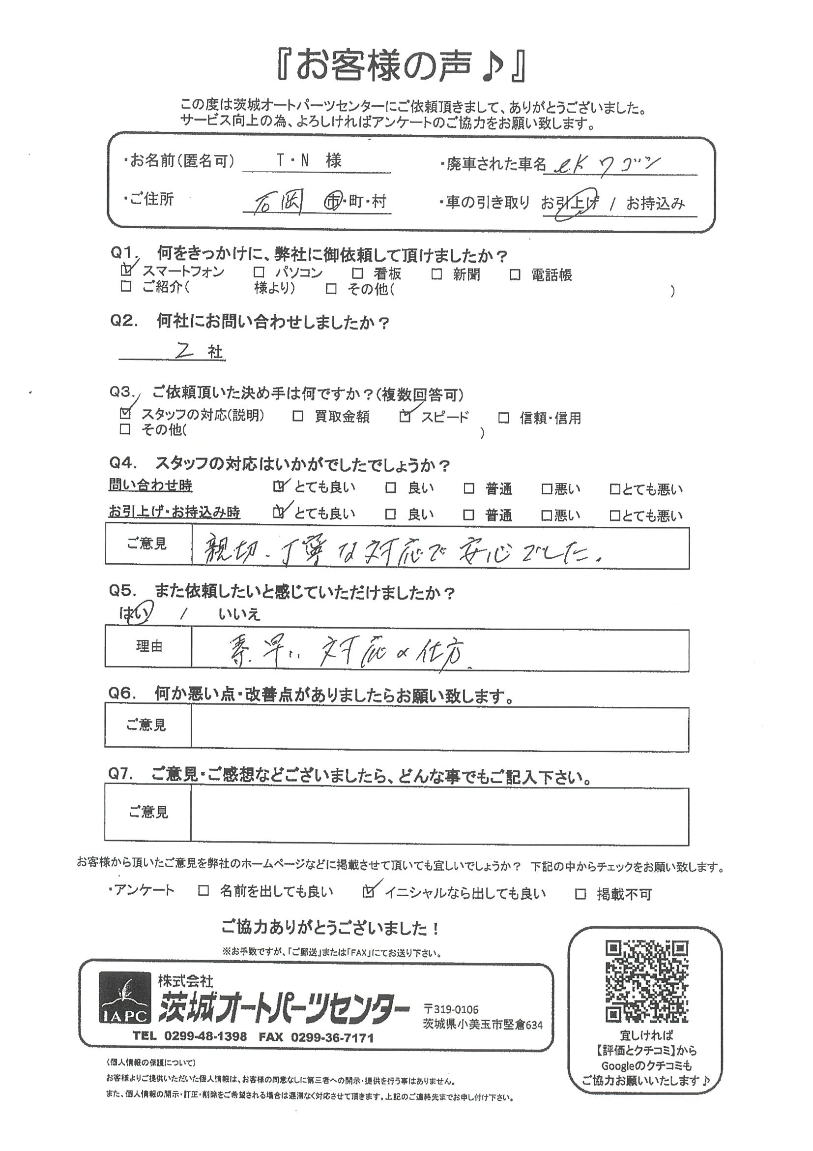 お礼:N・N様 この度は、廃車のご依頼ありがとうございます。