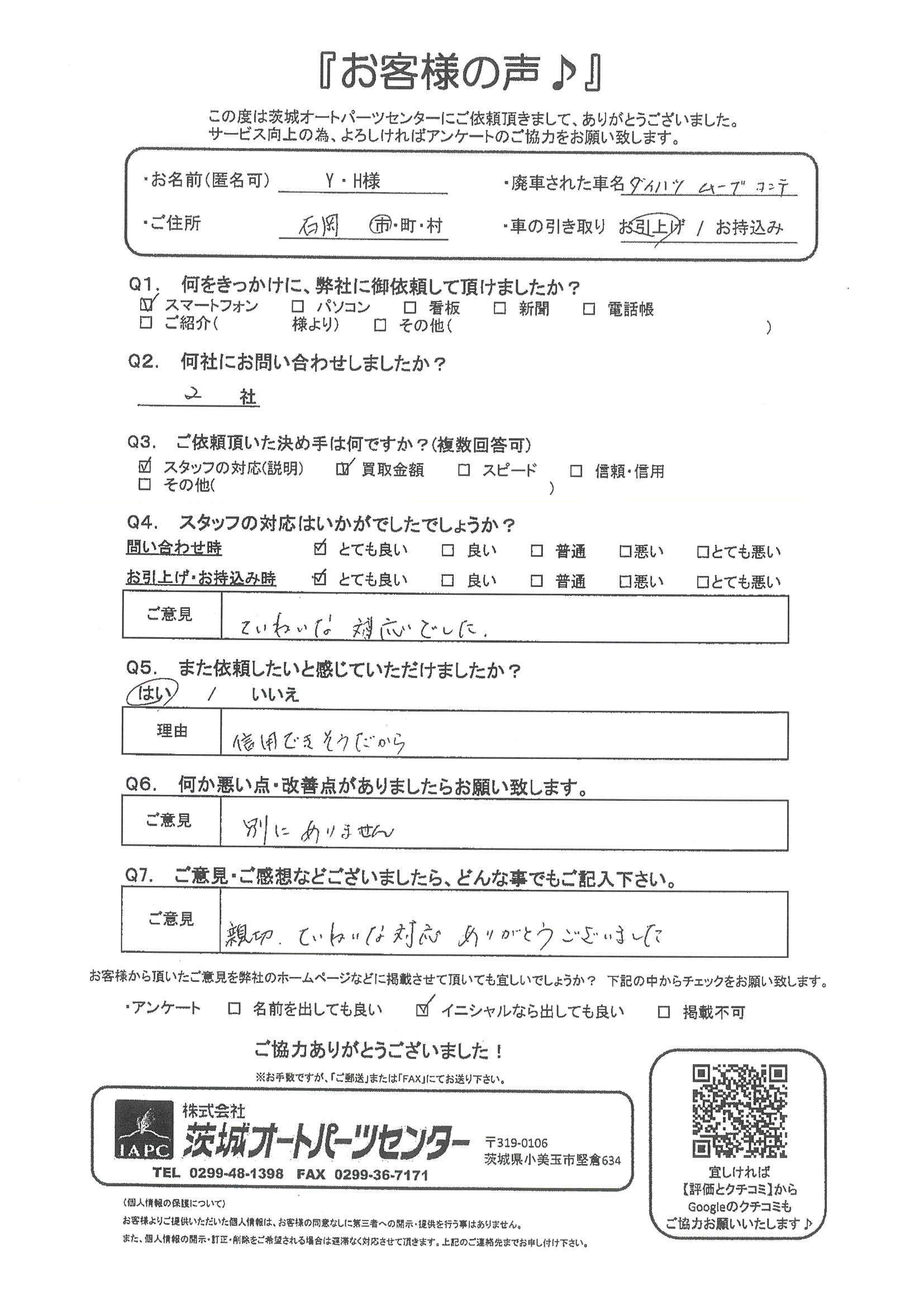 お礼:H・K様 この度は、廃車のご依頼ありがとうございます。