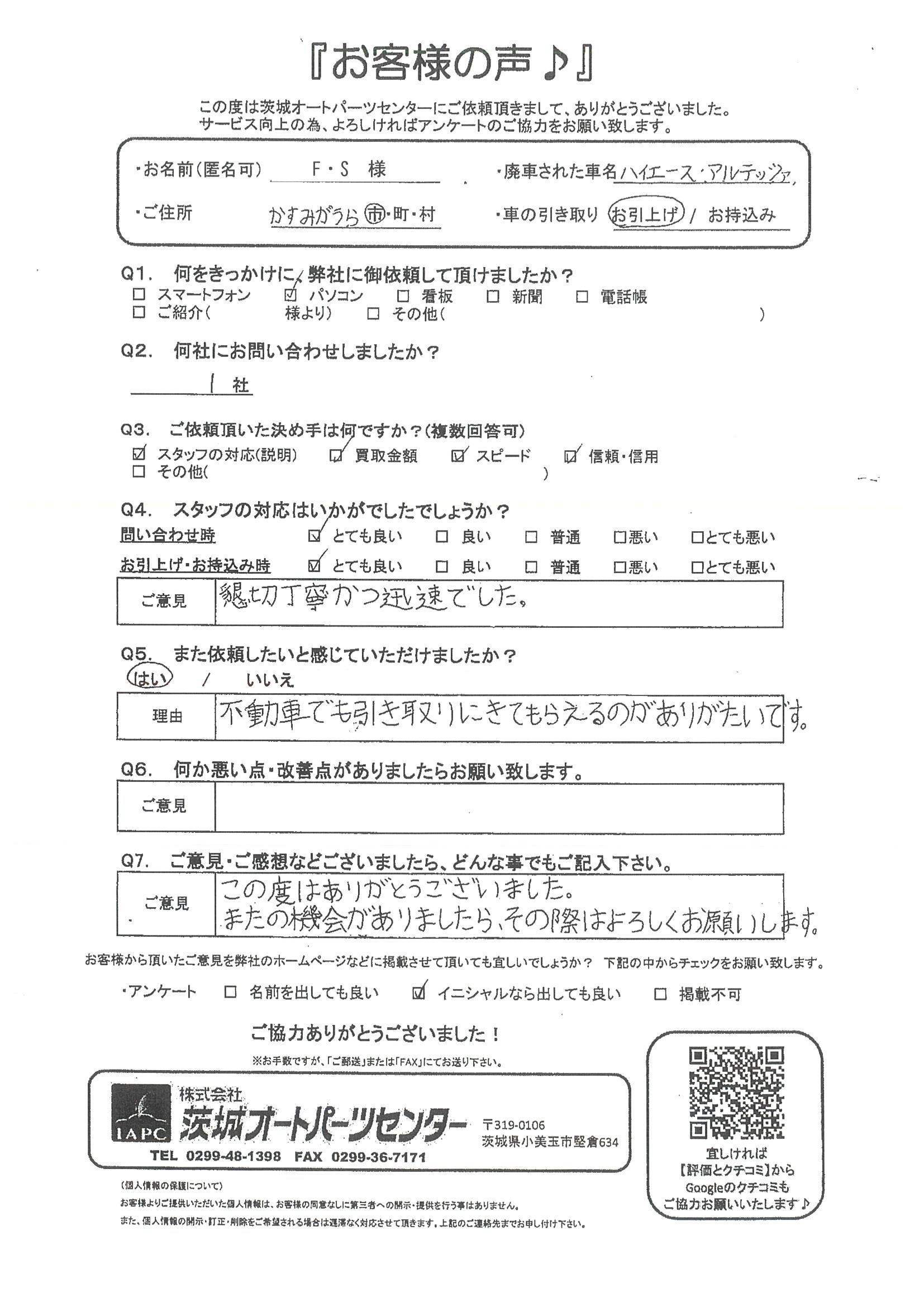 お礼:Rosa様 この度は茨城オートパーツセンターに廃車のご依頼を頂き、